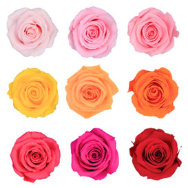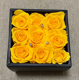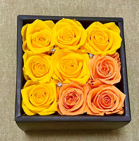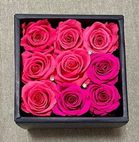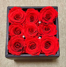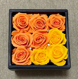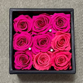 16センチ四方の黒い箱に入った鮮やかなバラ。
